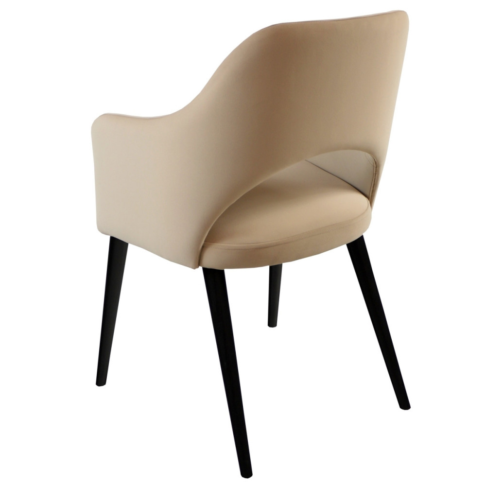 Dekoracyjne wycięcie w oparciu na wysokości odcinka lędźwiowego zapewnia stylowy wygląd, a zabudowane podłokietniki stanowią dodatkowe podparcie dla rąk. W siedzisku została zastosowana gruba gąbka oraz pasy, które zwiększają komfort podczas użytkowania zapewniając elastyczność poprzez odpowiednie dopasowanie do ciała. Siedzisko i oparcie są ze sobą połączone oraz tapicerowane. Podstawę mebla stanowią cztery nogi wykonane z drewna bukowego. Nogi lakierowane są w czarnym kolorze. Model wyróżnia się nowoczesnym stylem oraz charakterystyczną formą kubełkową, która zapewnia wygodne i komfortowe siedzenie na wiele godzin.