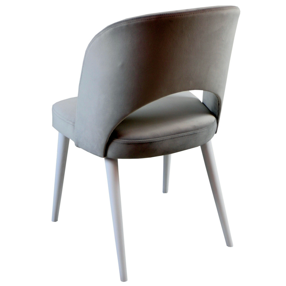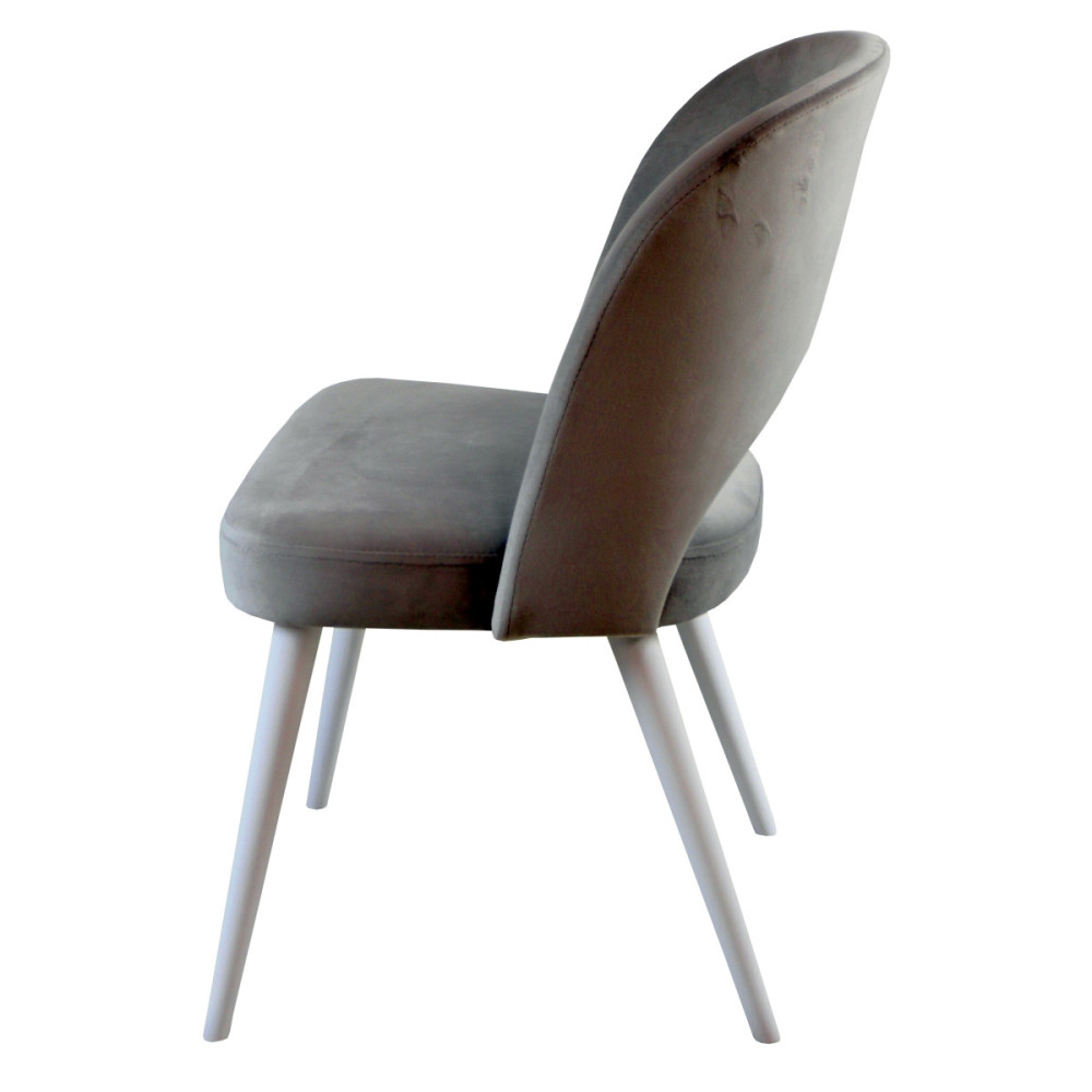 Materiał obiciowy krzesła jest plamoodporny i łatwy do czyszczenia. Szara tapicerka i białe nóżki to połączenie, które wprowadza do wnętrza elegancki nastrój.